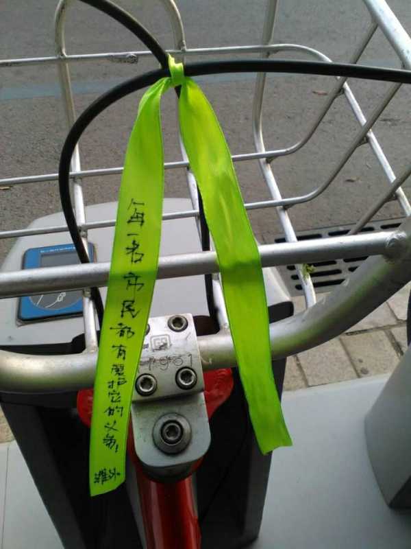 市公共自行車管理中心的一名工作人員表示,市民的這種愛心之舉可行,提醒大家愛護(hù)公共自行車。寫有愛護(hù)語的綠絲帶綁在車筐上面,并不影響公共自行車的使用,綠絲帶比較短,也不會存在危險(xiǎn)因素。