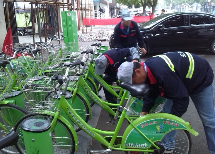 多輛公共自行車進行檢查、維修等養護作業,確保市民騎行安全。