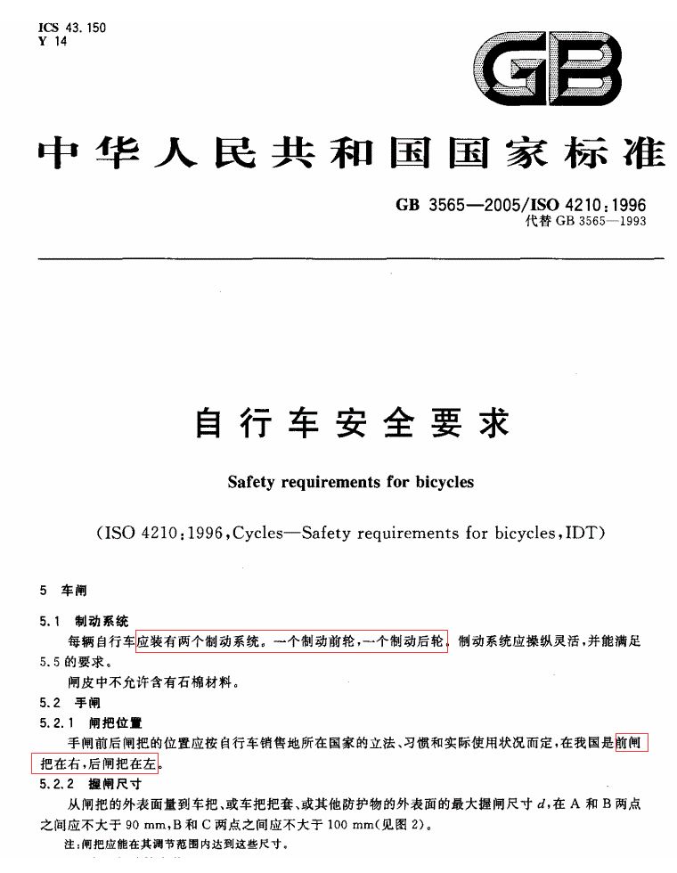 其實,在《中華人民共和國國家標準》關于“自行車安全的要求”中,我國對自行車的剎車有著明確且統一的標準和規定: