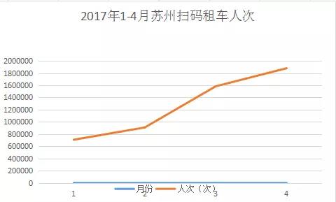 當你還為怎樣合理運營苦惱時,我們已經實現高質量服務。2017年1-4月掃碼租車騎行量呈明顯上升趨勢。月單次借車量高達1879046次,日用車量最大達117350次。