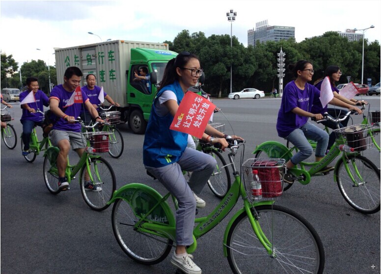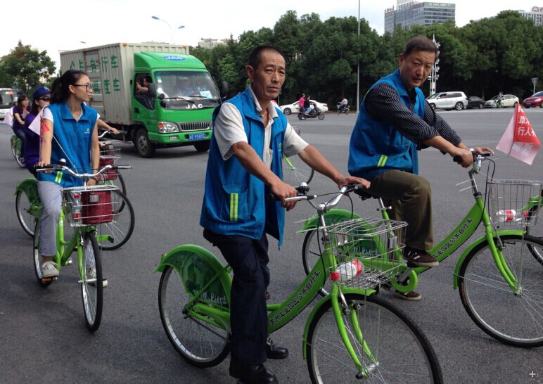 這次活動準備了30輛綠色自行車,掛上環保旗幟。沿著園區的主干道進行了1~2小時的騎行。騎行隊伍分為兩支,一支主要圍繞湖西商業中心進行騎行,一支圍繞湖東圓融廣場騎行。沿路向環衛工人等戶外工作人員發放愛心禮品。