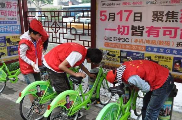 為了提倡愛護公共自行車,5月19日志愿者自發在石路站點清潔公共自行車,雖然當天下著雨,天氣有些冷,但志愿者依然不辭辛苦的擦拭公共自行車。感謝每位志愿者的辛勤勞動,感謝他們對公共自行車的關心和支持。我們將更好的服務來回報每位市民。