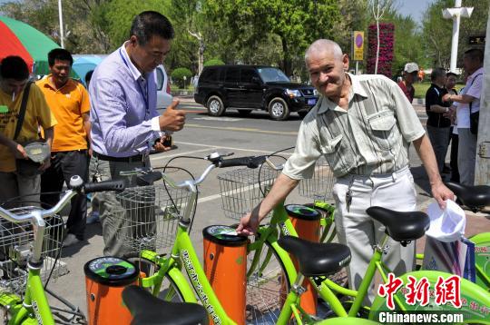 俄羅斯用戶在中國黑河刷卡租有樁“共享單車” 王殿杰 攝