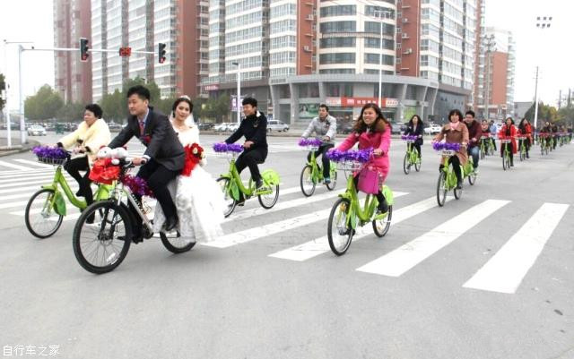 用公共自行車代替傳統婚車,沒有豪車,沒有奢華的場面,但親友團們組成的自行車陣,也賺足了市民的眼球,贏得百分百的回頭率。在高檔婚車“熱”的當下,低碳、環保的公共自行車迎親隊伍猶如雨后一抹新綠,讓人眼前一亮。這種浪漫的結婚方式讓婚禮變得更有意義。