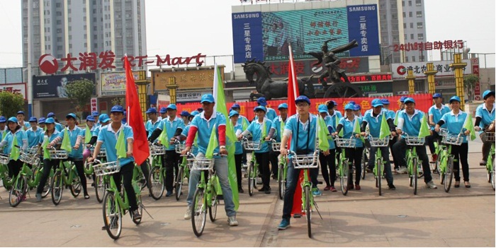 淮北分公司組織舉辦了千人騎行活動。綠色的公共自行車,配上寫有環(huán)保標(biāo)語的小旗幟,再加上綠色的領(lǐng)隊旗,現(xiàn)場的場景頗為壯觀。