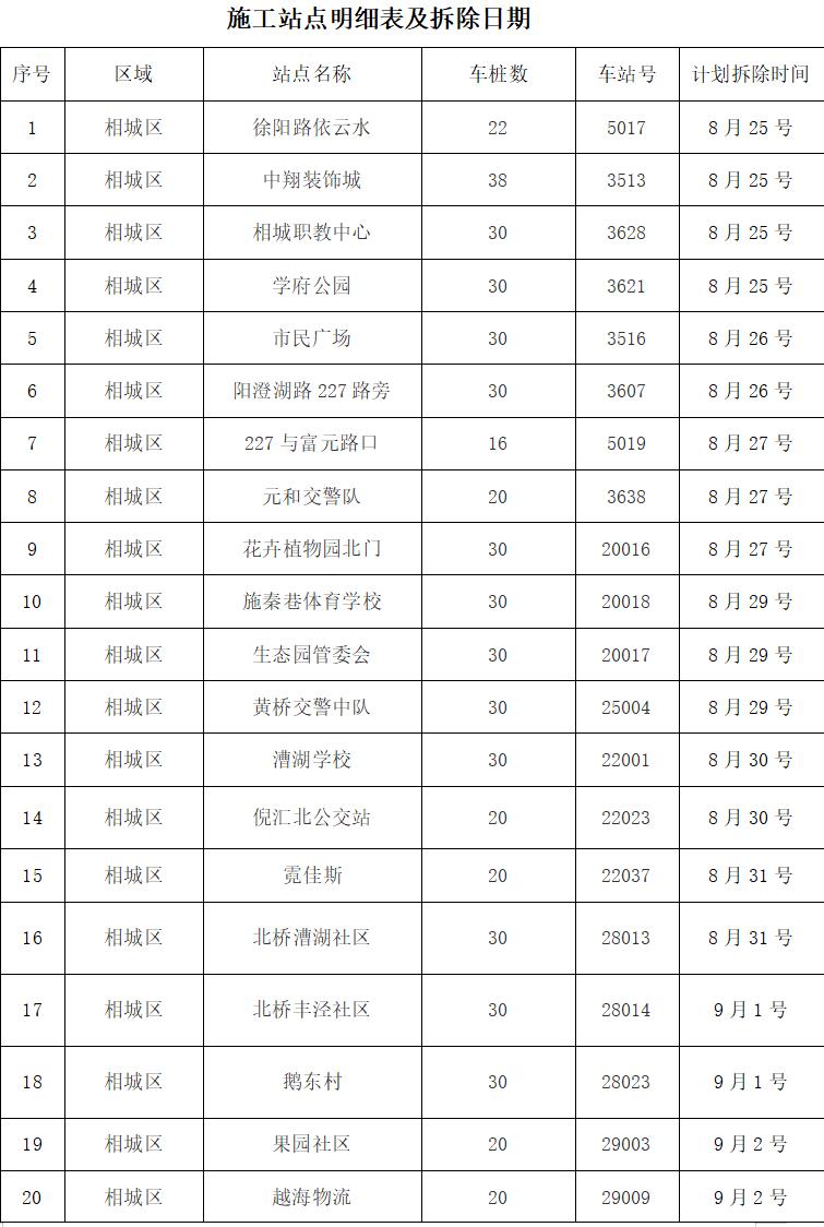 因公共自行車站點運(yùn)營調(diào)整,蘇州市現(xiàn)有52個站點將于近期拆除,給您帶來的不便敬請諒解。具體拆除站點及施工安排時間如下: