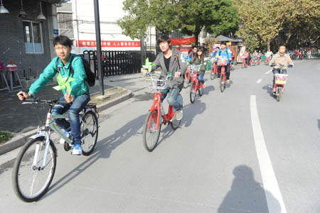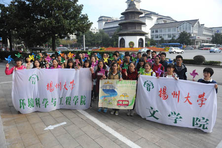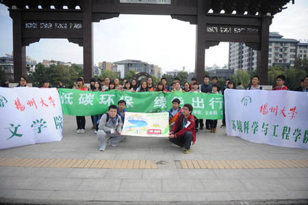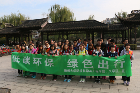 為宣傳“低碳環(huán)保,綠色出行”的理念,獻(xiàn)禮揚(yáng)州建城2500年,11月9日上午,揚(yáng)州大學(xué)環(huán)境學(xué)院與文學(xué)院的同學(xué)們以“把綠色奉為夢想,把夢想視為行動”為宗旨,發(fā)起了一場“綠色揚(yáng)州行”活動。同學(xué)們踏起揚(yáng)州公共自行車,騎行揚(yáng)州城,向市民發(fā)出倡議——“將低碳生活進(jìn)行到底。”