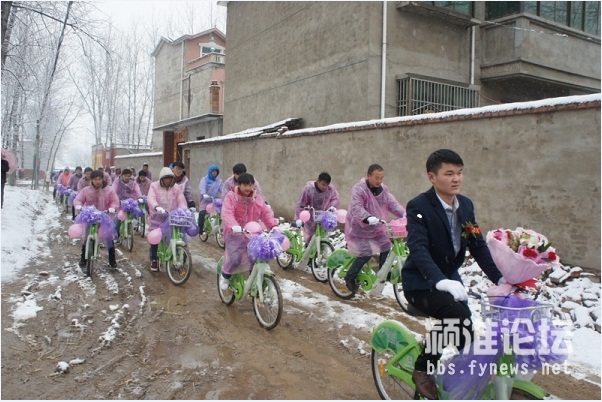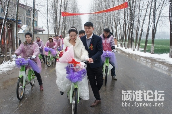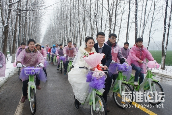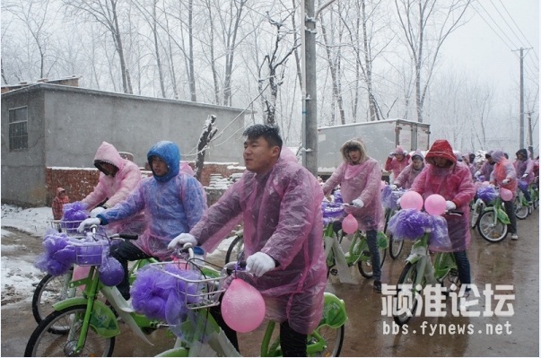 30輛公共自行車整齊碼開,時云濤“打頭陣”騎在最前面,后面時云濤的親朋好友們,四人一排,整齊劃一。因為一直在下大雪,新郎的家人還特別貼心的為騎自行車的人們準備了防寒的手套和粉色的雨衣,穿著小粉,騎著小綠,浩浩蕩蕩去新娘家迎親去,一支騎著公共自行車的婚車隊伍“招搖過街”也是賺足了回頭率,有不少路人駐足觀看,沿街接受路人的祝福,再配上這漫天大雪,簡直太浪漫了。新娘閆瑞金告訴記者:“時云濤平時在生活中就是一個非常浪漫的人,兩人在談戀愛時就經常會想出許多有創意的點子我開心,這次用公共自行車來迎親也是讓我非常意外,而且也非常有紀念意義,我相信這個婚禮會讓我終身難忘。外面一直在下雪,我也非常感動,他也和迎親隊伍一路騎車過來,相信我們以后一定會幸福到永遠。”