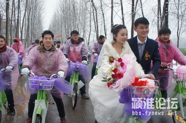 時云濤是一名年輕的90后,在阜陽臨沂商城從事門業生意。新娘名叫閆瑞金,是行流鎮高橋村人,新娘和新郎是高中同學,兩人戀愛至今已經走過了四五個年頭,大學期間兩人分隔兩地,新郎時云濤在大一時退學回家創業,自主創業生意也是越來越紅火,事業有成接下來就要抱得美人歸了,結婚無疑是一件人生大事,這結婚就是要結的與眾不同,什么樣的結婚形式才能更別出心裁呢,時云濤在采辦結婚用品的時候,碰巧看見了停放在臨沂商城附近的公共自行車,時云濤就想如果用公共自行車當婚車,不僅節能環保,而且整齊劃一,想想那齊刷刷排整齊的自行車迎親隊伍,效果應該是不一般的吸引眼球吧,于是這個創意婚禮的念頭就這樣應運而生。