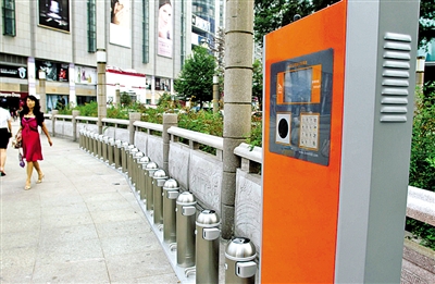 位于聯合廣場東側的大南門世貿大廈服務點,是10個已建成的服務點之一。記者看到,這一服務點由一個橘黃色的控制器和20個鎖止器組成。控制器像個大柜子,上面有刷卡區、按鍵區及顯示屏,可供市民查詢借車卡余額、附近服務點空位等信息。而鎖止器像一個樁子,實行每車一“樁”,頂部有刷卡區及車鎖,市民借車、還車時,借車卡都要觸碰“樁”上的刷卡區。據悉,一輛公共自行車造價為500元,而一個鎖止器的價格為1400多元,一個控制柜的價格為5000多元。