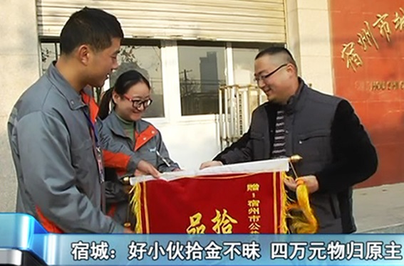 宿州公共自行車管理中心工作人員李文龍在外作業時,在公共自行車車籃里撿到了一只裝有4萬元現金的皮包,并通過管理中心查詢到了失主的聯系方式,把丟失的財物交還到失主付先生手里。據付先生回憶,當天上午,付先生在騎完公共自行車以后,回到單位才發現忘記把隨身的包帶走,正著急的時候,就接到宿州公共自行車管理中心的電話讓他來認領。為表感激,付先生特意來到管理中心給李文龍及所在的宿州公共自行車管理中心贈送了錦旗,并想以一定現金表示感謝,但李文龍婉言拒絕,并表示他只是做了自己應該做的事。