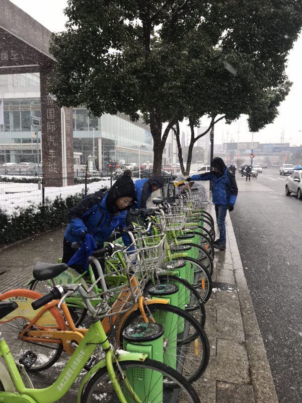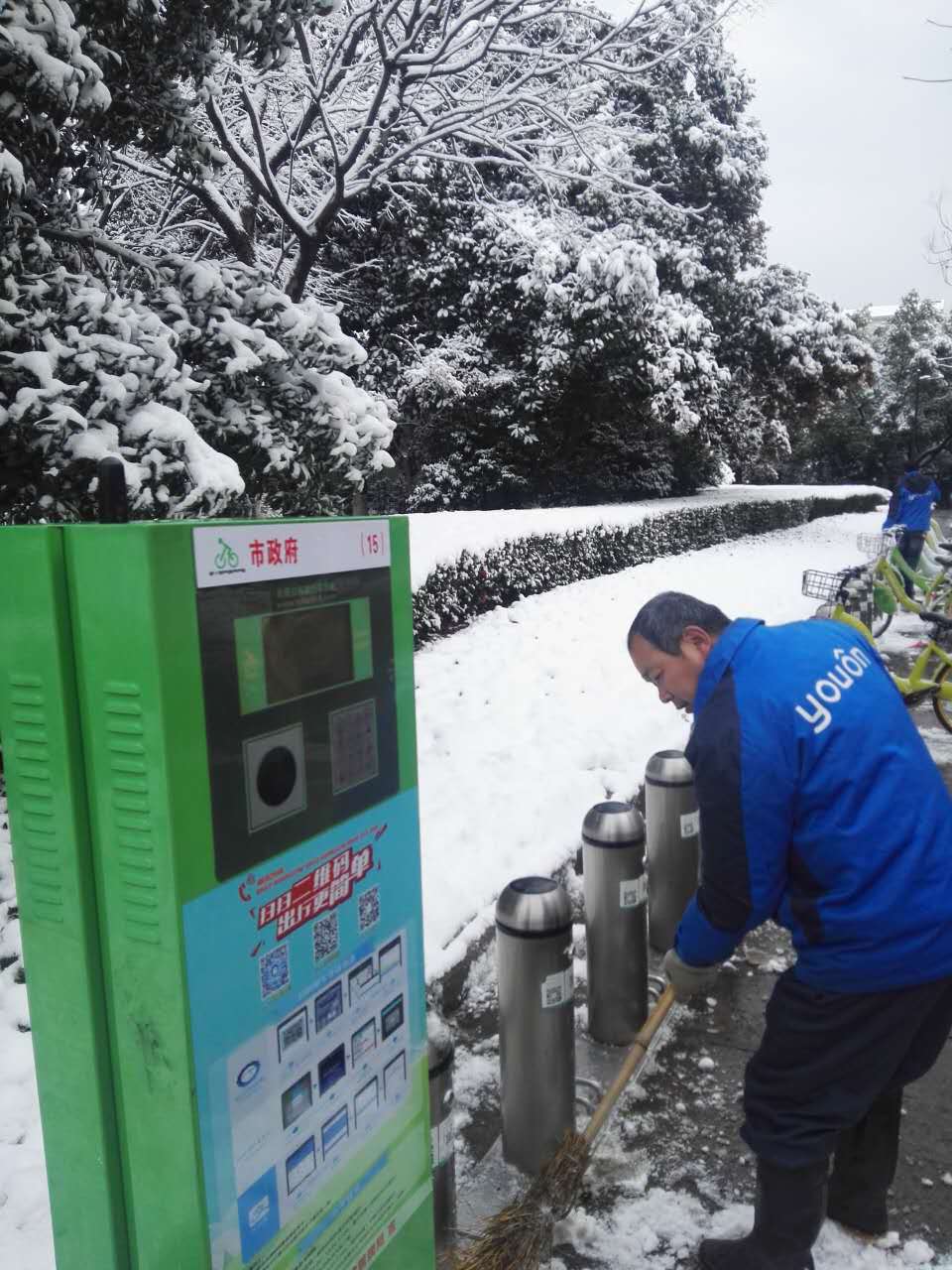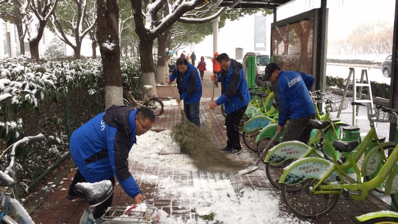 2018年1月25日,蘇州下起了暴雪,斷斷續續持續至28日的清晨。路面上、公共自行車站點上的積雪和地面冰塊給市民的出行帶來了不便。25日中午12點,蘇州公共自行車管理中心發布了站點停運通知。26日起,永安行蘇州分公司由管理層帶隊,全體工作人員,在公共自行車系統停運期間,早早來到公司奔赴一線清掃積雪、檢查站點樁位、車輛情況。為后期站點開通,保障廣大市民騎行安全,做好準備工作。