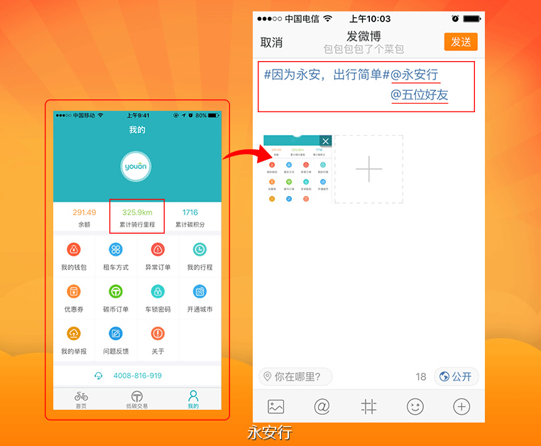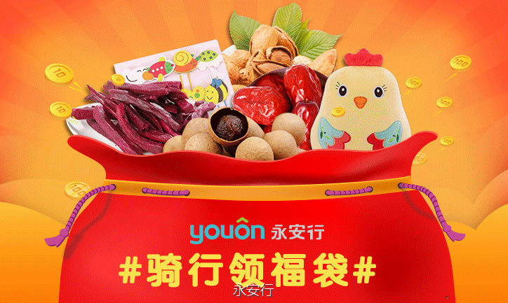 活動詳情:在規定時間內,關注“永安行”官方微博,將你的永安行app中,"累計騎行里程"截圖發到微博,帶上話題#因為永安,出行簡單#,@永安行 以及5位好友,均有機會獲得“永安新年驚喜福袋”。